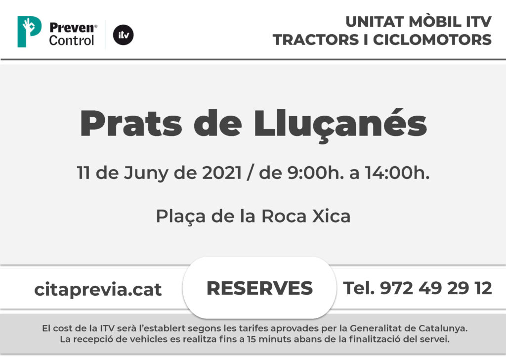 Divendres 11 de juny la Unitat Mòbil d’Inspecció Tècnica de Vehicles (ITV) s’instal·larà a la plaça de la Roca Xica de Prats de Lluçanès per tal que els propietaris de maquinària agrícola (tractors i remolcs) puguin passar la inspecció tècnica.