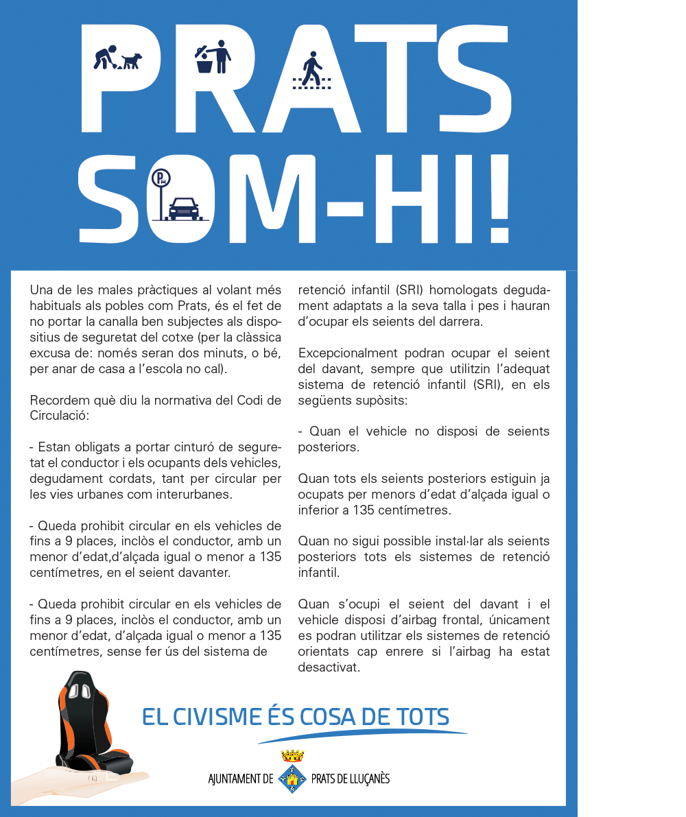 Una altra de les males pràctiques al volant més habituals als pobles com Prats, és el fet de no portar la canalla ben subjectes als dispositius de seguretat del cotxe (per la clàssica excusa de: només seran dos minuts, o bé, per anar de casa a l’escola no cal).
