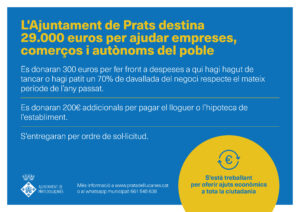 En aquest sentit, es donaran 300 euros per fer front a despeses a qui hagi hagut de tancar o hagi patit un 70% de davallada del negoci respecte el mateix període de l’any passat. I es donaran 200€ addicionals per pagar el lloguer o l’hipoteca de l’establiment. Els ajuts s’entregaran per ordre estricte de sol·licitud.