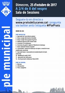 El ple ordinari se celebrarà dimecres 25 d’octubre de 2017, a 2/4 de 8 del vespre a la Sala de Plens de l’Ajuntament. Es podrà seguir en directe a www.historic.pratsdellucanes.cat i participar-hi via Twitter amb l’etiqueta #PlePrats.