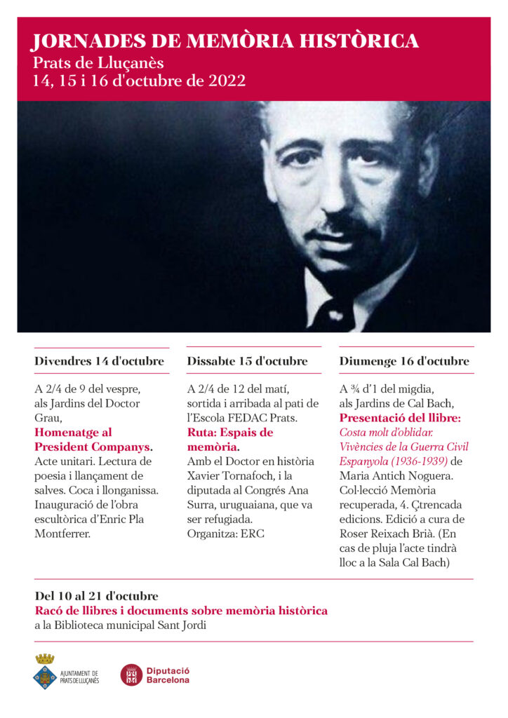 L’acte que donarà el tret de sortida serà l’homenatge a Lluís Companys que es farà divendres 14 d’octubre, a 2/4 de 9 del vespre, on també tindrà lloc la inauguració de l’obra escultòrica d’Enric Pla Montferrer dedicada al president Companys als Jardins del Doctor Grau.