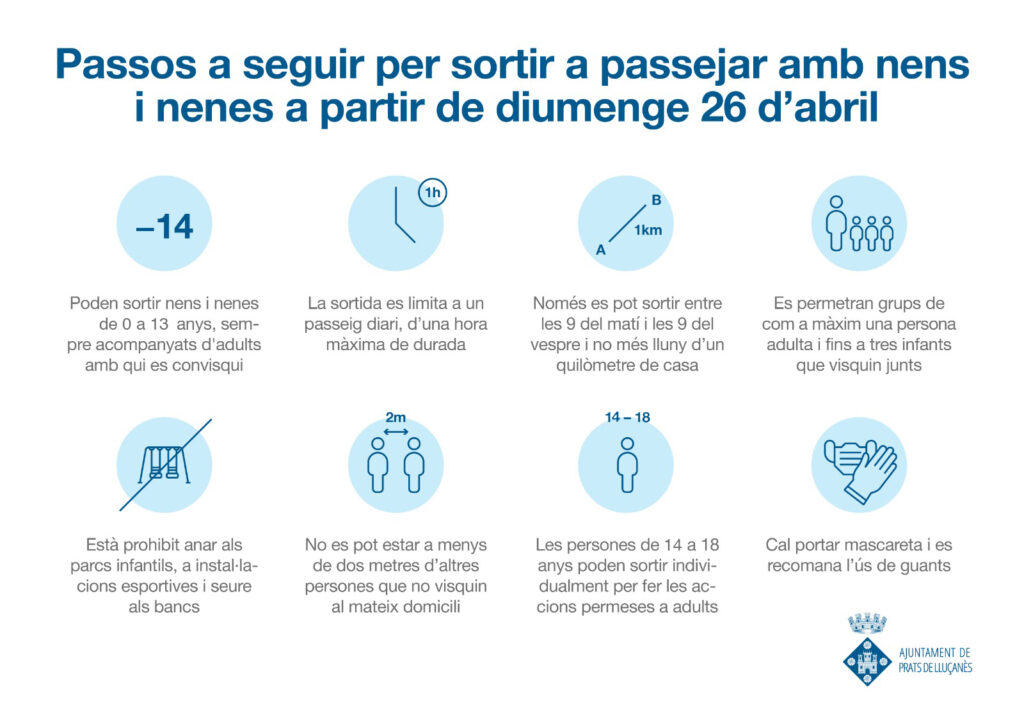 Podran sortir nens i nenes menors de 0 a 13 anys, sempre acompanyats d’adults amb qui es convisqui. La sortida es limita a un passeig diari, d’una hora màxima de durada, no es pot anar més lluny d’un quilòmetre de casa i només es pot sortir entre les 9 del matí i les 9 del vespre.