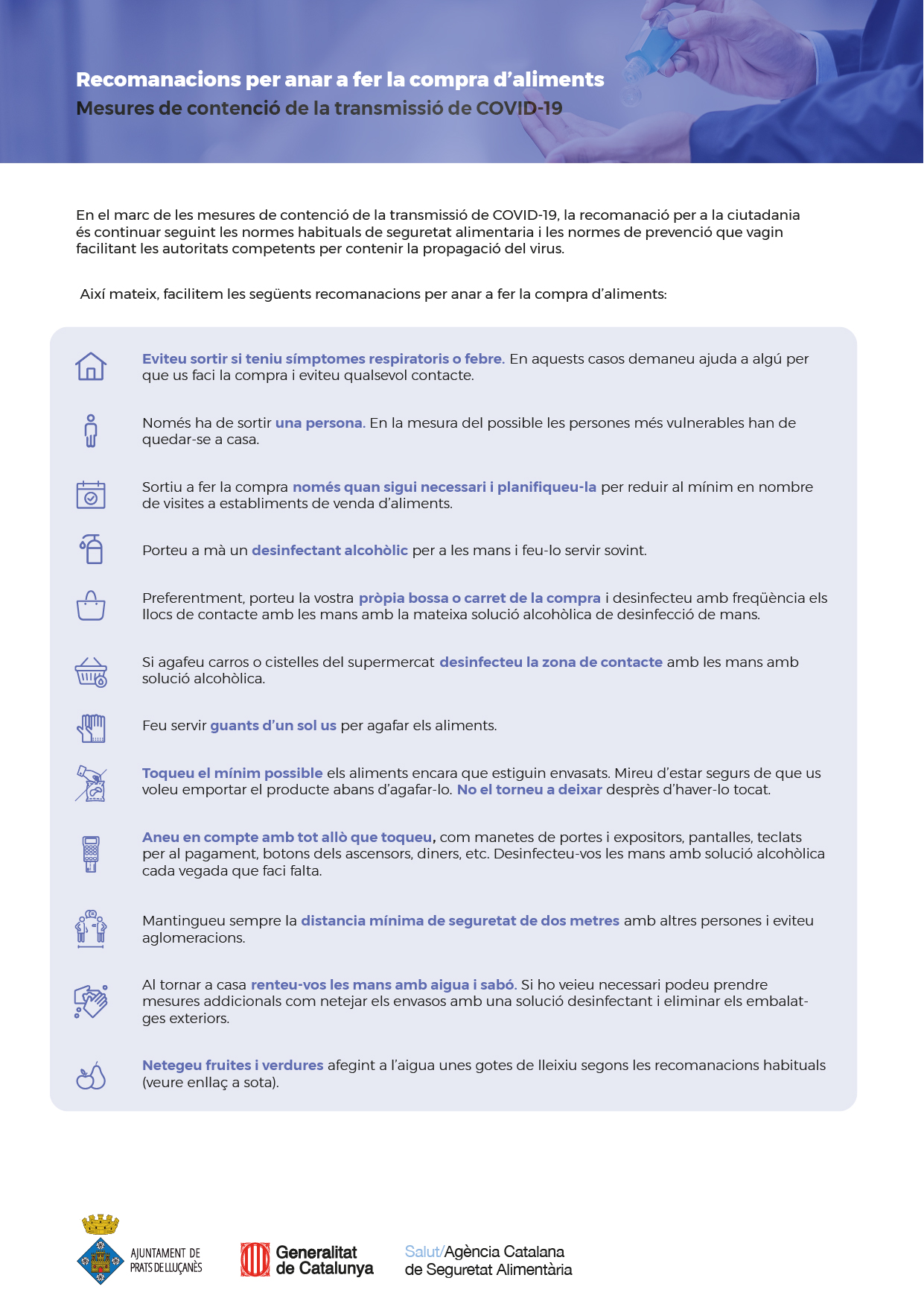 - Si agafeu carros o cistelles del supermercat desinfecteu la zona de contacte amb les mans amb solució alcohòlica.